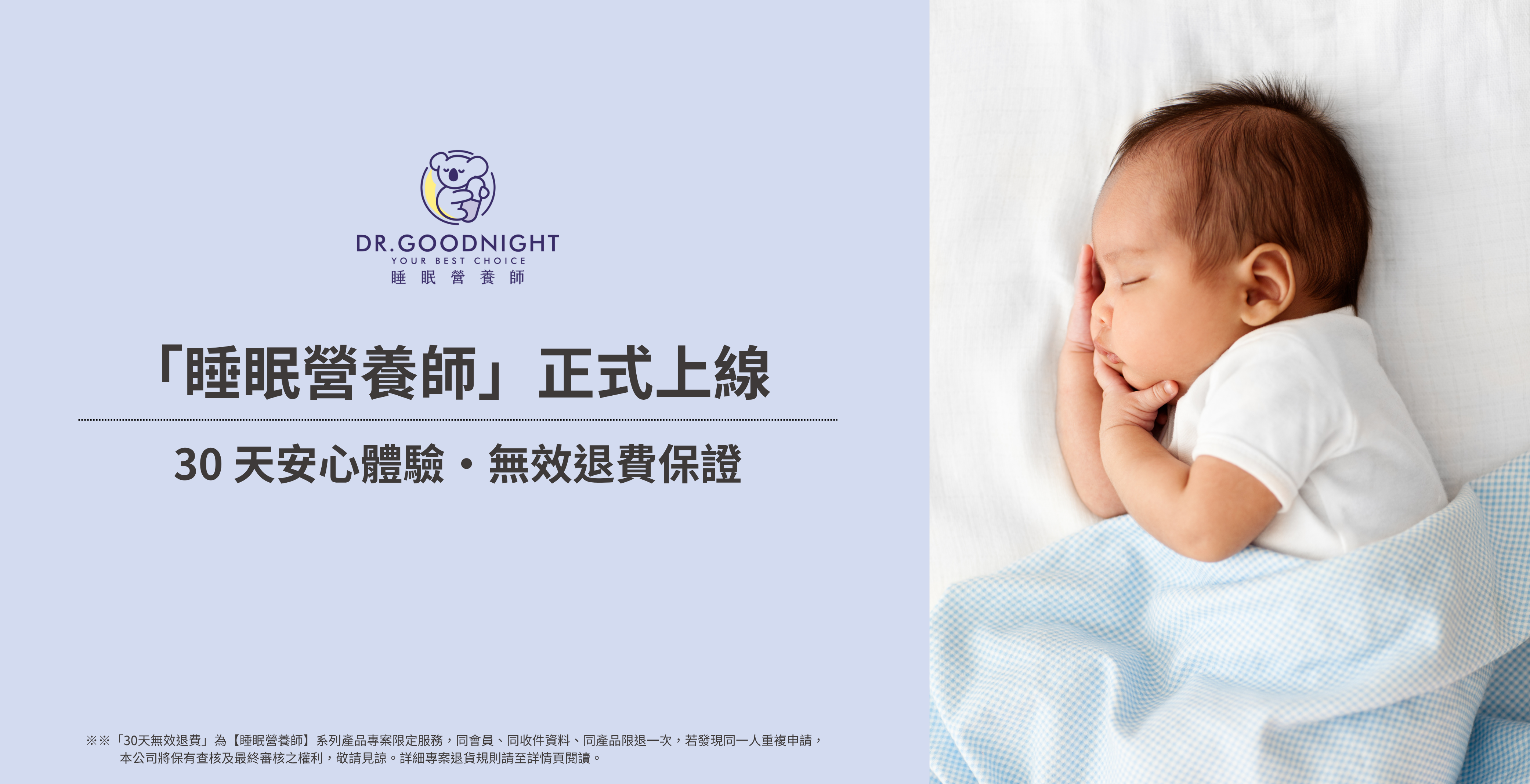 • 「30天無效退費」為【睡眠營養師】系列產品專案限定服務,同會員、同收件資料、同產品限退一次,若發現同一人重複申請,本公司將保有查核及最終審核之權利,敬請見諒。