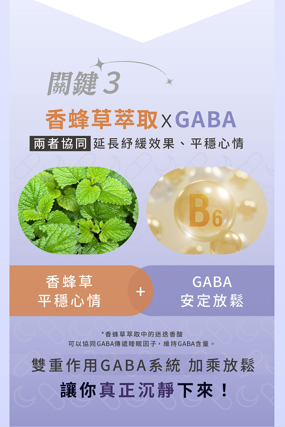 3️⃣ 延長放鬆效果:香蜂草萃取 + 高濃度 GABA,延長紓緩效果、平穩心情。